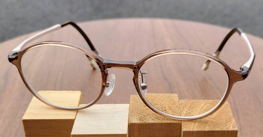 前メガネはメタル素材のスッキリライン丸フレームをお使い頂いてましたが、今回はイメージを変えてとの事で樹脂フレームをお選び頂きました